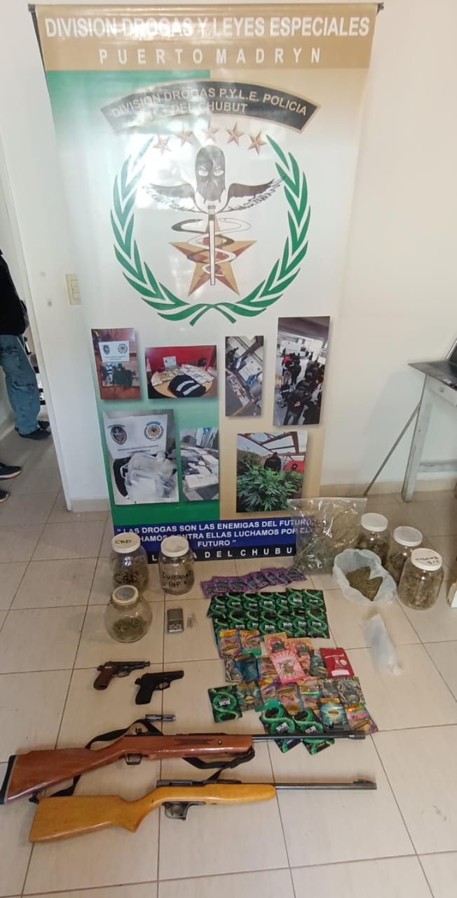 En Puerto Madryn, la investigación de la Policía del Chubut – bajo la supervisión del Ministerio Público Fiscal- se llevó adelante por el lapso de dos meses y culminó con cinco allanamientos en los que se detuvo a cuatro personas, se incautó medio kilo de marihuana, tres armas de fuego, balanzas de precisión y otros elementos de interés.