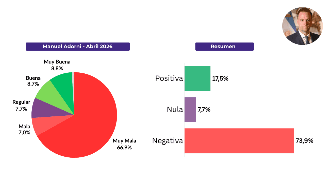 En cambio, Manuel Adorni aparece como una de las figuras más castigadas del oficialismo, con una imagen negativa que trepa al 73,9%, un nivel excepcionalmente alto incluso para un escenario de fuerte polarización. Su desgaste parece estar directamente vinculado a la centralidad que ocupó en las semanas recientes, tanto por su nivel de exposición pública como por las denuncias vinculadas a posibles hechos de corrupción, un terreno especialmente sensible para un gobierno que construyó buena parte de su legitimidad sobre la promesa de enfrentar a “la casta”.