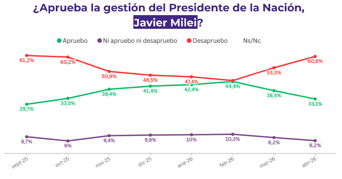Por un lado, pesa el empeoramiento de la microeconomía de los hogares, ya desarrollado en el informe, que reduce la tolerancia frente al ajuste cuando el deterioro deja de ser promesa de transición y se vuelve experiencia cotidiana. Por otro, se suma un desgaste político y moral cada vez más visible: las denuncias de corrupción en la gestión, la ruptura del relato anticasta y la creciente sensación de que el Gobierno nacional no controla adecuadamente esos desvíos erosionan uno de los principales activos simbólicos con los que Milei construyó su liderazgo. En ese cruce entre frustración material y decepción moral aparece una clave central de abril: ya no se resiente sólo la evaluación de la gestión, sino también la figura presidencial como síntesis política de ese proceso.