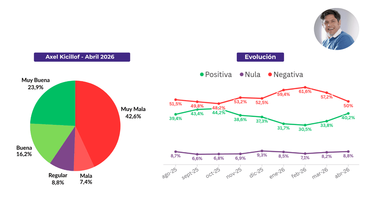 Por su parte, Axel Kicillof muestra una recuperación relevante de imagen y logra salir del momento más débil de la serie reciente. Luego de haber tocado en febrero un piso de 30,5% de imagen positiva, en la medición actual cruza nuevamente la barrera de los 40 puntos y alcanza el 40,2%, mientras la negativa retrocede al 50%. El dato no alcanza todavía para hablar de una consolidación plena, pero sí marca un cambio de tendencia políticamente significativo: en un contexto de creciente descontento con el Gobierno nacional, Kicillof empieza a capitalizar parte de ese malestar como una referencia opositora. Su mejora parece nacer de un corrimiento del humor social frente al desgaste del oficialismo, en una coyuntura donde la microeconomía de los hogares sigue bajo presión y la percepción sobre la situación del país continúa siendo crítica. En ese escenario, Kicillof empieza a afirmarse como una de las figuras opositoras con mayor capacidad para canalizar ese descontento y consolidarse como referencia alternativa frente al Gobierno nacional.