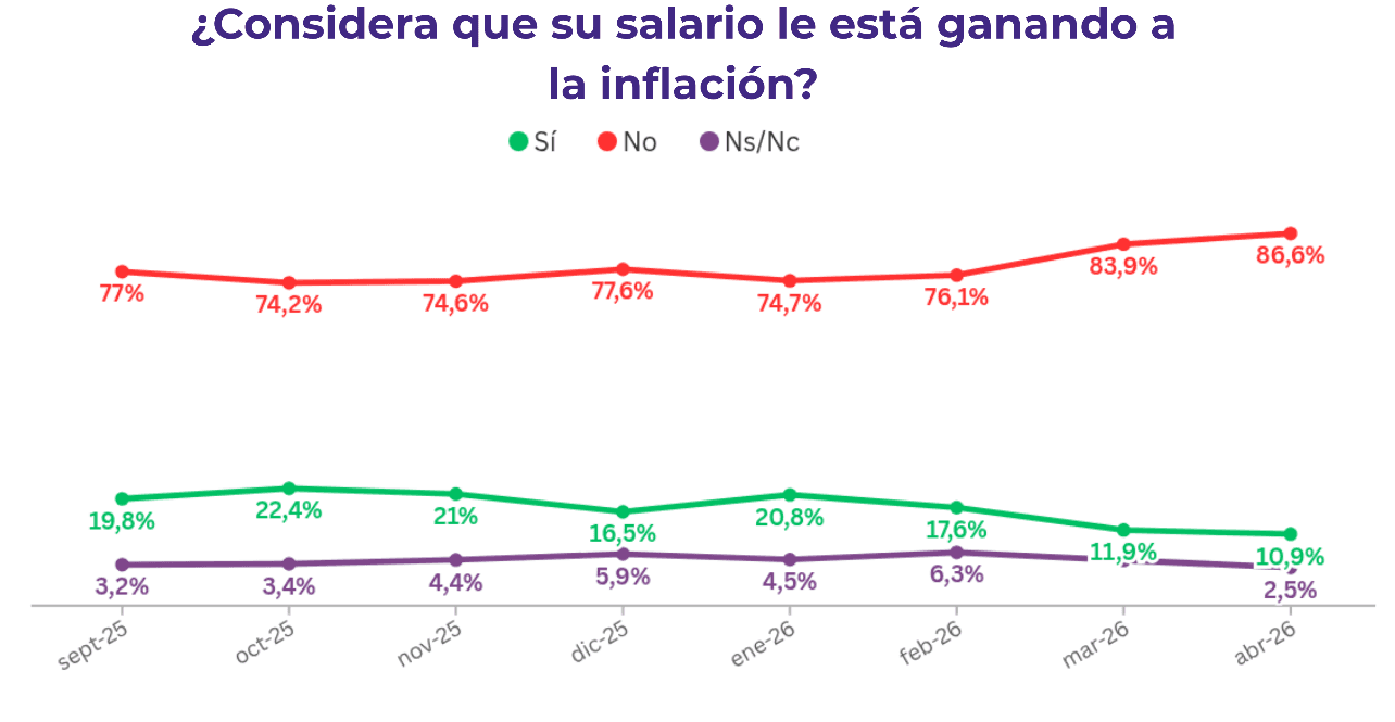 Esa desconfianza encuentra una explicación concreta en el bolsillo. El 86,6% afirma que su salario no le gana a la inflación, el peor registro de toda la serie reciente, por encima del 74,7% de enero y del 83,9% de marzo. Ahí está el núcleo del problema: la sociedad no compara el dato oficial con una abstracción, sino con el resultado material que deja en la vida diaria. La inflación ya no se mide en decimales, sino en cuánto dura el ingreso, cuánto margen queda después de pagar lo básico y hasta qué fecha del mes se puede sostener el consumo habitual. Por eso, cuando el índice baja, pero el salario sigue sin recomponer poder de compra, el dato pierde capacidad de persuadir. El número oficial puede ordenar la macro, pero si no corrige la experiencia real del hogar, deja de ser creíble para una mayoría social.