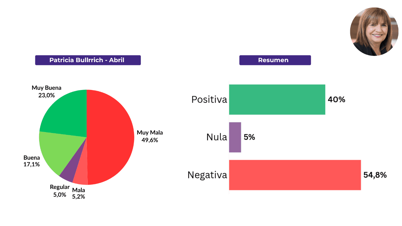 Mientras tanto, Patricia Bullrich logra sostener una imagen positiva relevante y muestra una resistencia mayor al desgaste que hoy afecta a otras figuras del oficialismo. Con un 40,1% de valoración positiva frente a un 54,8% de negativa, su perfil aparece como menos golpeado por la coyuntura inmediata, algo que puede leerse en relación con el lugar político que ocupa: desde el Poder Legislativo, su figura parece quedar más asociada a una idea general de orden, autoridad y cambio que a la gestión cotidiana del Gobierno. En ese marco, ni los problemas de la microeconomía ni las denuncias vinculadas a posibles hechos de corrupción parecen impactarla del mismo modo que a los rostros más expuestos del oficialismo nacional. Más que como ejecutora directa del presente, Bullrich sigue siendo leída por una parte del electorado como una expresión política de rumbo, firmeza y transformación, lo que le permite preservar mejor su capital simbólico en un contexto general de desgaste.