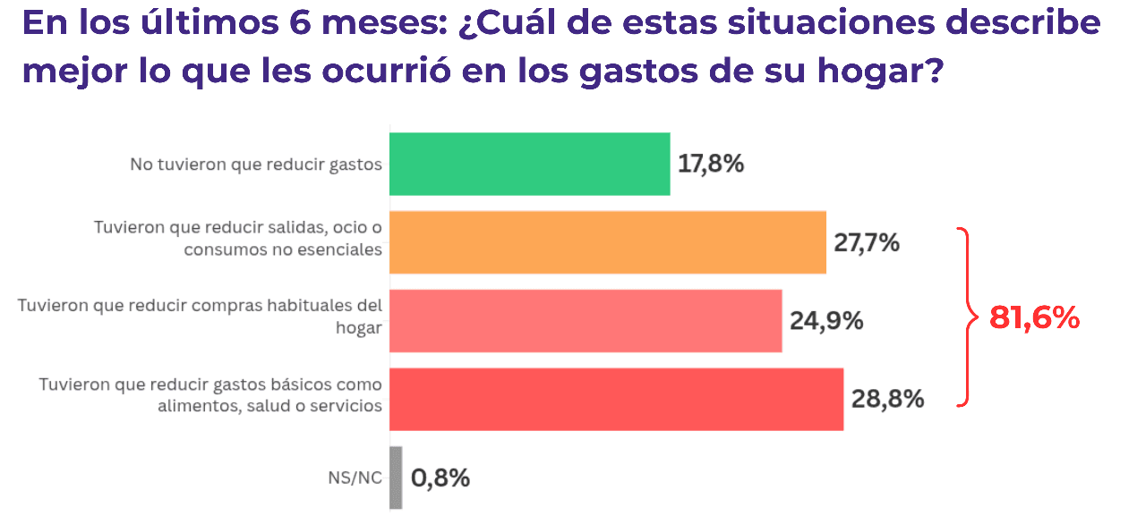 A este desgaste por las denuncias de corrupción y por la ruptura del pacto anticasta se le suma, además, un malestar económico que Zentrix ya viene registrando en las mediciones previas y que en abril vuelve a aparecer con mucha fuerza en la vida cotidiana de los hogares. Los datos sobre economía doméstica terminan de darle cuerpo concreto a ese malestar: el 81,6% de los consultados reconoce que en los últimos seis meses tuvo que resignar algo para sostenerse, desde salidas, ocio o consumos no esenciales hasta compras habituales del hogar y, en los casos más delicados, gastos básicos como alimentos, salud o servicios.