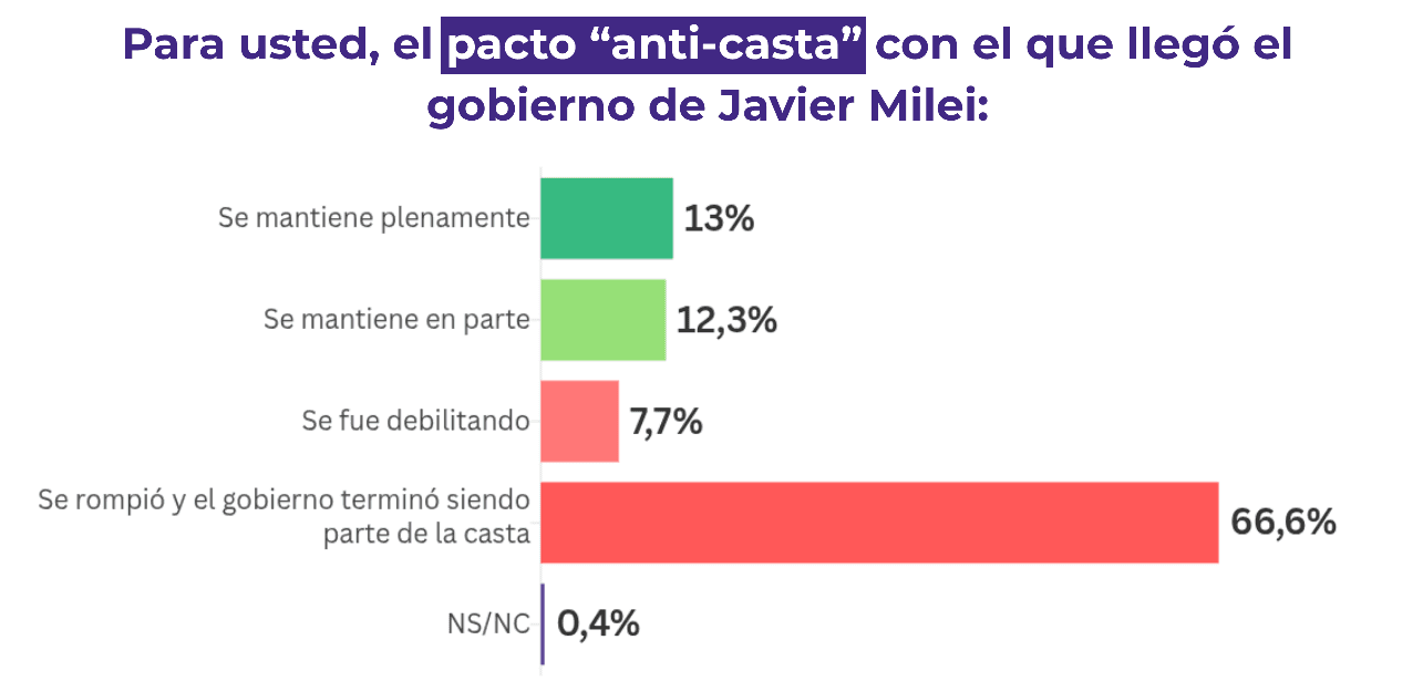 La principal bandera simbólica con la que Javier Milei llegó al poder empezó a mostrar señales claras de desgaste. La promesa de enfrentar a la denominada casta, que durante meses funcionó como núcleo de legitimidad política y moral del oficialismo, aparece hoy más debilitada frente a una opinión pública que empieza a simbolizar al Gobierno como esa continuidad de prácticas que decía venir a combatir. Los datos sobre economía doméstica terminan de darle cuerpo concreto a ese malestar: el 81,6% de los consultados reconoce que en los últimos seis meses tuvo que resignar algo para sostenerse, desde salidas, ocio o consumos no esenciales hasta compras habituales del hogar y, en los casos más delicados, gastos básicos como alimentos, salud o servicios.