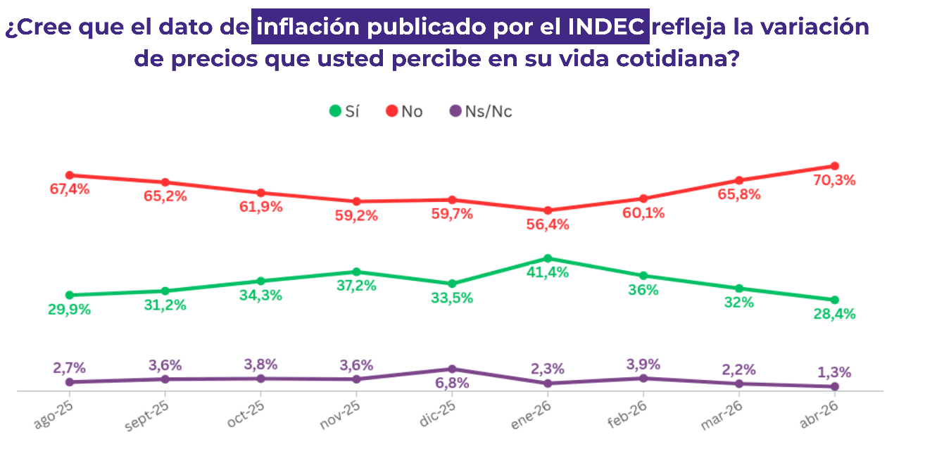 En abril, la distancia entre la economía que informa el INDEC y la economía que viven los hogares volvió a ampliarse. El 70,3% de los consultados considera que el dato oficial de inflación no refleja adecuadamente la variación de precios que percibe en su vida cotidiana, un salto importante respecto de enero, cuando esa mirada alcanzaba al 56,4%, el valor más bajo de la serie. No se trata sólo de una discusión sobre metodología o sobre cómo se construye un índice: lo que aparece es una crisis de validación social del dato público. Cuando la inflación oficial deja de coincidir con la sensación cotidiana de encarecimiento, el problema deja de ser estadístico y pasa a ser político, porque se debilita la confianza en una de las referencias centrales con las que el Gobierno busca reforzar el debate económico.