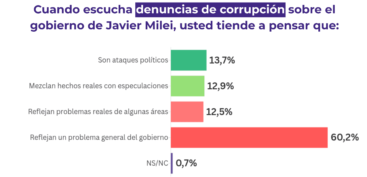 Ese deterioro, además, no puede leerse sólo como un fenómeno opositor. La corrupción aparece como el principal desafío del país, incluso entre quienes votaron al oficialismo en 2025, por encima del desempleo, la inflación o el salario, lo que muestra que el problema ya perfora al propio universo simbólico del mileísmo. Sin embargo, la manera de procesarlo sigue siendo distinta según el posicionamiento político: entre oficialistas todavía predomina una lectura que busca encapsular el problema en casos aislados y preservar parte de la excepcionalidad moral del Gobierno; entre opositores, en cambio, se consolida una mirada mucho más dura, donde la corrupción ya no aparece como desvío sino como rasgo de época del oficialismo. Esa diferencia revela dos cosas al mismo tiempo: que Milei todavía conserva un núcleo dispuesto a amortiguar el costo reputacional, pero también que por fuera de ese núcleo el veredicto social se volvió mucho más severo. Por eso, el problema de fondo para el Gobierno no es sólo el impacto coyuntural de las denuncias, sino que la bandera anticasta, que durante meses funcionó como fuente de autoridad moral y de tolerancia política frente al ajuste, empieza ahora a invertirse y a transformarse en un punto de vulnerabilidad.