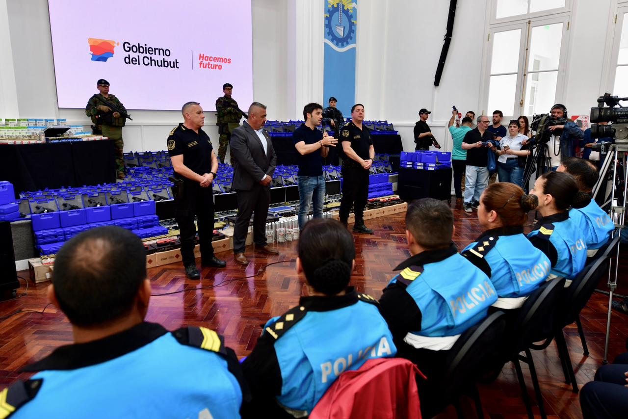 El gobernador Ignacio “Nacho” Torres, encabezó este miércoles la entrega de millonario armamento y municiones a efectivos de la Policía de la provincia, en un acto desarrollado en la Casa de Gobierno en Rawson, y que constituyó una inversión histórica en cuanto a equipamiento para la fuerza provincial. En total se distribuyeron mil pistolas marca Bersa a distintas dependencias chubutenses, así como cartuchos y granadas que fueron adquiridos por el Ejecutivo Provincial por un monto cercano a los 950 millones de pesos.