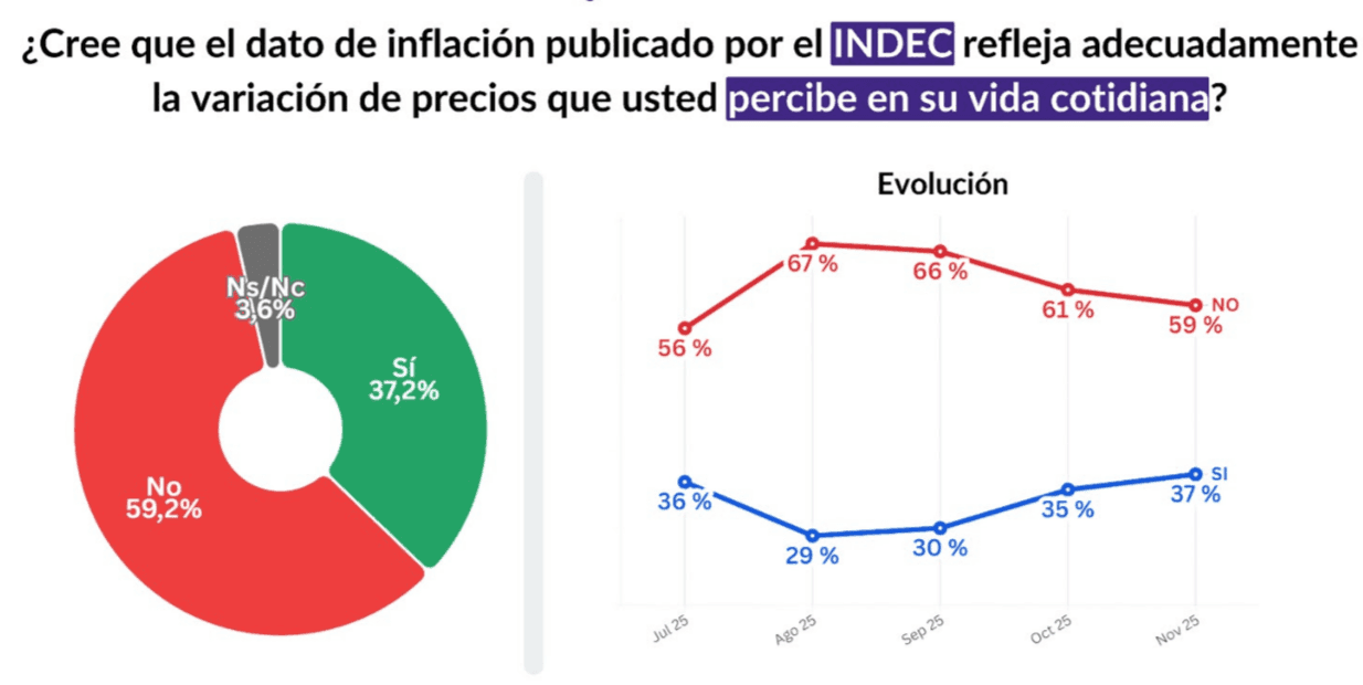 La confianza en el INDEC muestra en noviembre una mejora leve pero consistente. El 37,2% declara confiar en las cifras oficiales, frente a un 59,2% que mantiene una postura de desconfianza. Aunque esta última continúa siendo mayoritaria, el crecimiento de la confianza respecto del mes anterior señala un proceso incipiente de recuperación institucional. El nivel actual no modifica del todo el escepticismo acumulado, pero sí introduce una tendencia más favorable en la percepción pública del organismo.