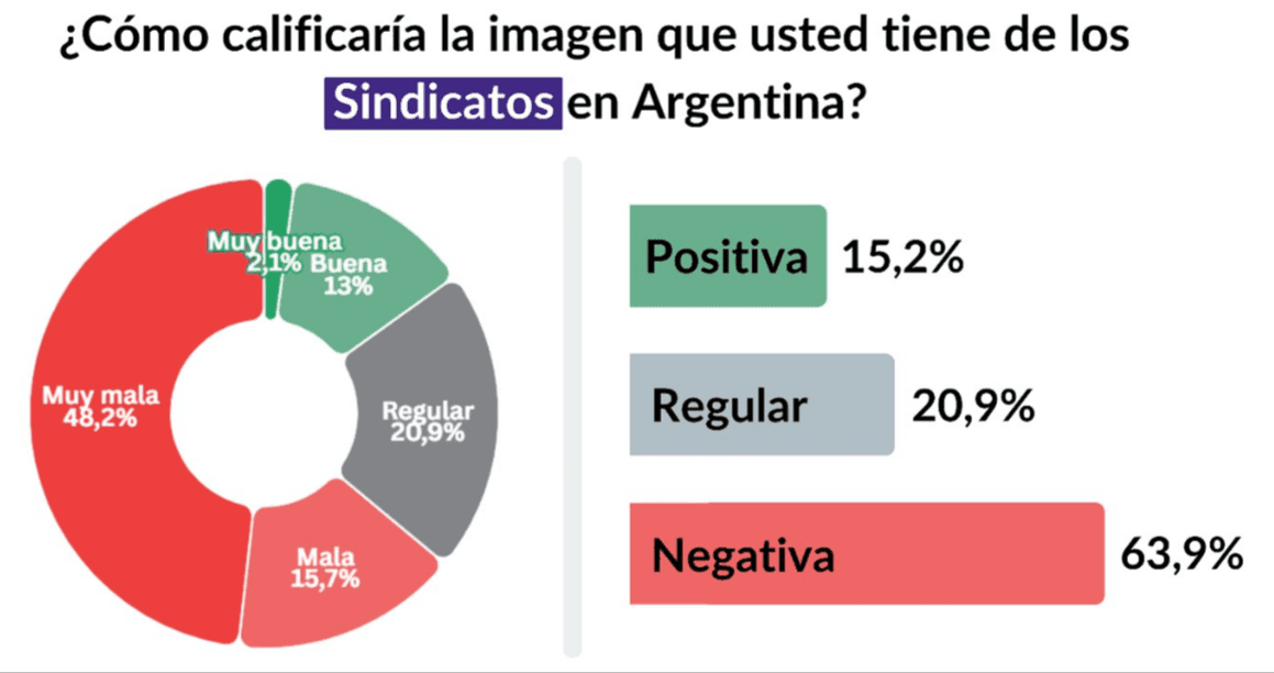 La imagen de los sindicatos constituye otro punto crítico. Los datos muestran una desconfianza estructural: sólo 15,2% declara una percepción positiva, mientras que 63,9% expresa una valoración negativa. El rechazo no obedece únicamente a posicionamientos ideológicos. También expresa una experiencia acumulada de distancia con las preocupaciones cotidianas, percepción de estructuras burocráticas y dirigencias encapsuladas desde hace décadas. El contraste entre su peso histórico y la legitimidad actual queda evidenciado en el relevamiento, donde incluso entre votantes peronistas –su base sociológica tradicional– la negatividad alcanza el 30,2%, revelando que la crisis de confianza excede cualquier frontera partidaria.