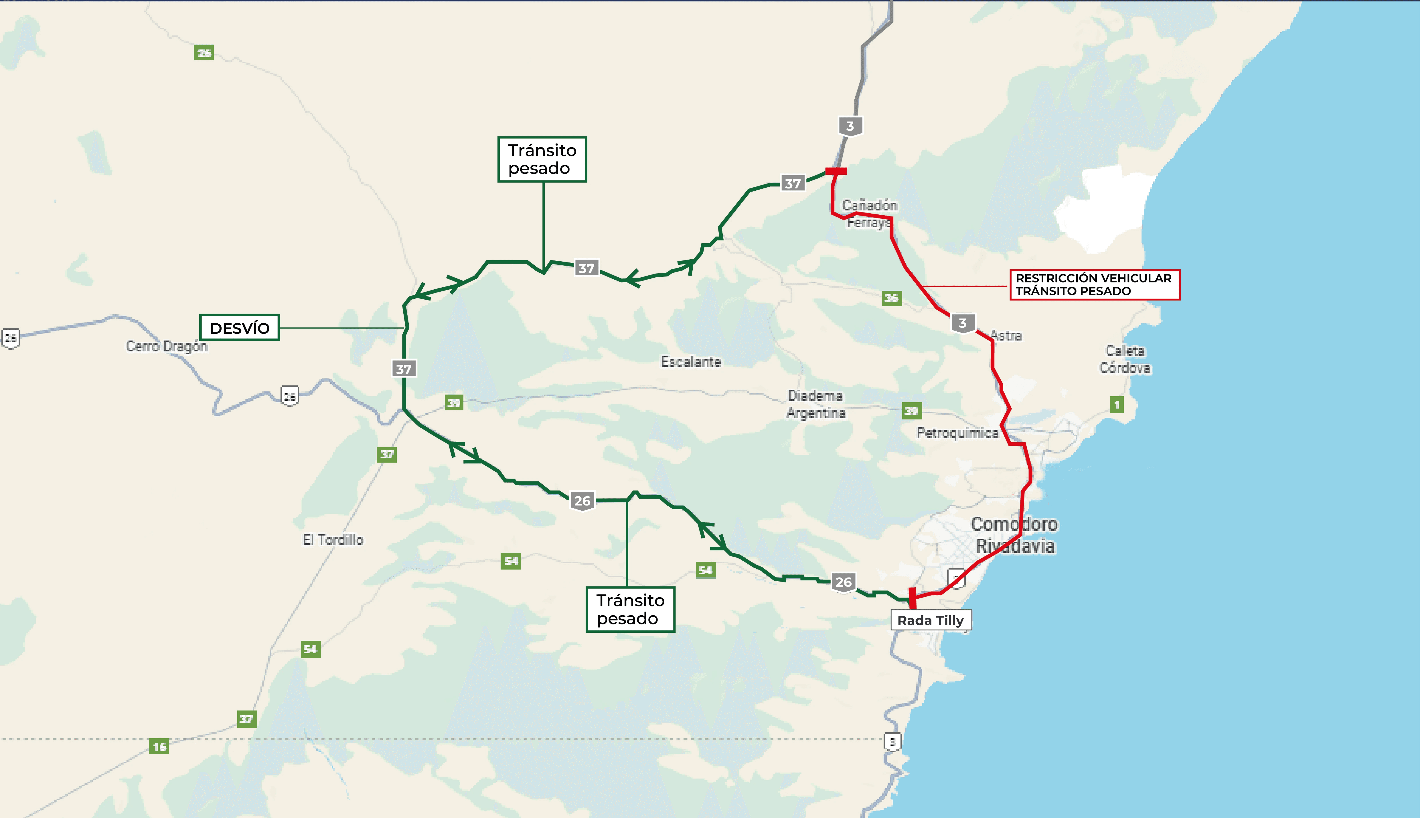 Durante la restricción habrá un operativo de seguridad vial a cargo de personal de Gendarmería Nacional, APSV y Policía de la provincia de Chubut. Vale destacar que esta medida no afecta a los vehículos livianos ni transportes de pasajeros de media y larga distancia. Los camiones de abasto que tengan que ingresar a la ciudad, deberán hacerlo por los sectores establecidos por el municipio local.