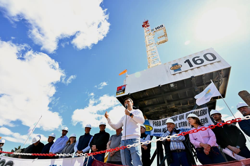 El gobernador Ignacio "Nacho" Torres, encabezó el acto de presentación del equipo que realizará el segundo pozo no convencional en Cerro Dragón, a partir de una millonaria inversión de la empresa Pan American Energy, en el marco del plan piloto para la reconversión de la Cuenca Golfo San Jorge.