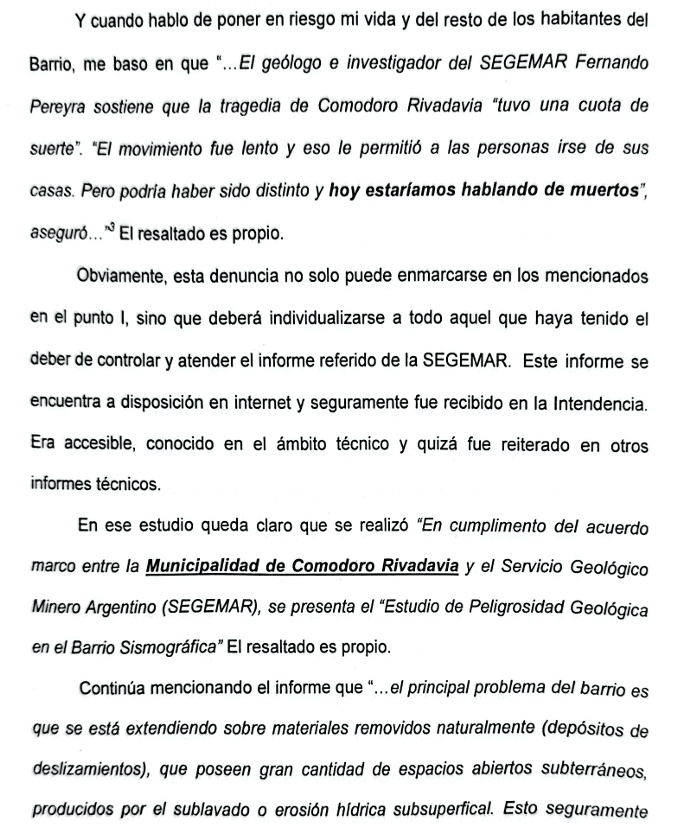 El documento también cita el informe elaborado por el Servicio Geológico Minero Argentino (SEGEMAR) en 2002, donde se alertaba por la peligrosidad de que avanzaran las urbanizaciones en el sector, ya que las viviendas y las obras eran llevadas a cabo sobre "materiales removidos naturalmente" en el cerro Hermitte, con una gran cantidad de espacios abiertos subterráneos; es decir, sobre terreno poroso y endeble.