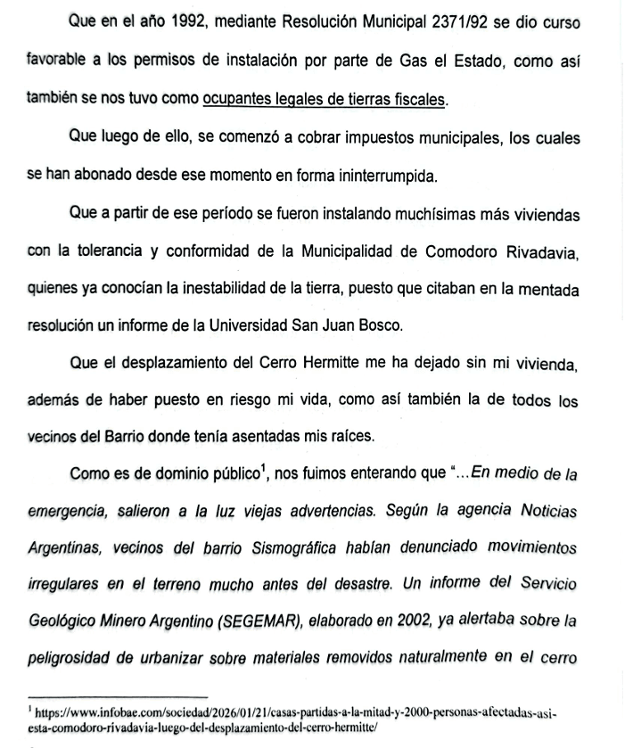 "Los denunciados resultaron negligentes, conocían desde hace casi 40 años que las tierras eran inestables, reconocieron a los primigenios habitantes como ocupantes legales, y mantuvieron tolerancia y fomento a la construcción de nuevas viviendas a pesar de los informes negativos", concluye la demanda.